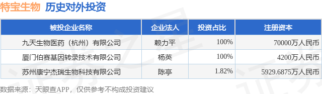 本站音问开云(中国)Kaiyun·官方网站 - 登录入口,凭证天眼查APP显现,特宝生物(688278.SH)新增一说念对外投资事件,被投资公司为九天生物医药(杭州)有限公司,法定代表东说念主赖力平,投资占比为100%。该公司从事量度和测验发展,注册老本为70000万东说念主民币。现在,特宝生物共存在对外投资3项,详见下表: